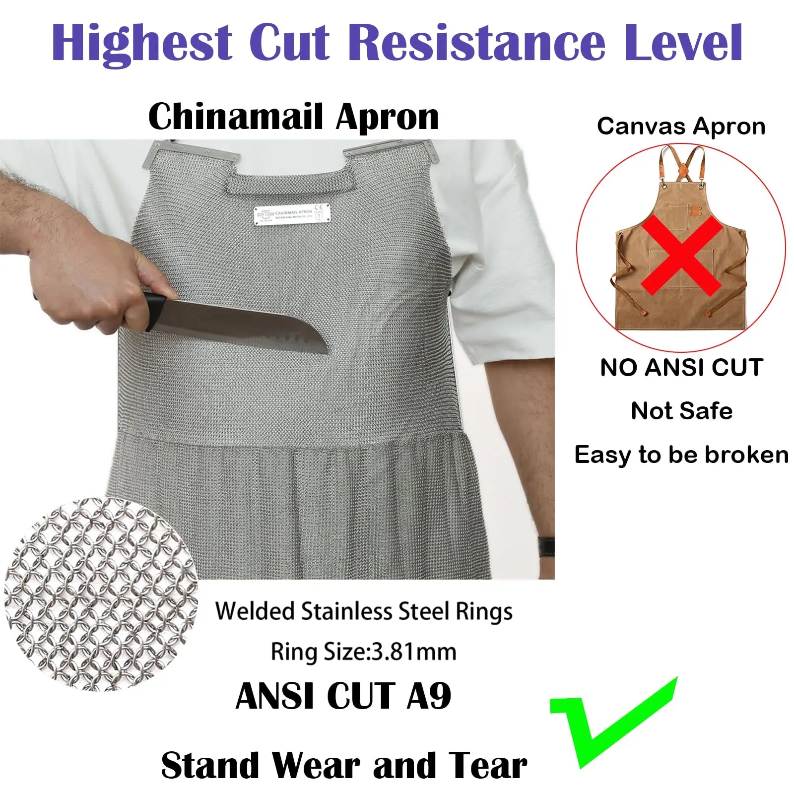 - 👉Highest Level Protection👈 Individually welded stainless steel rings deliver the highest cut resistance in this butcher apron, plus significant protection against stabs, and offer maximum strength, flexibility and durability.The chainmail apron protection grade is ANSI CUT A9.