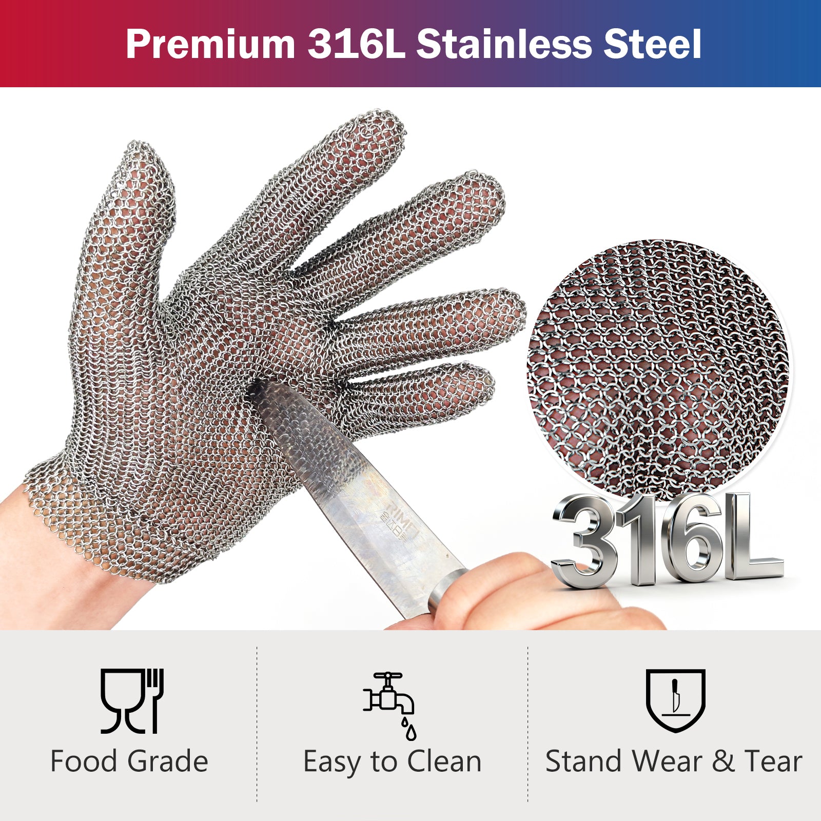 - FOOD GRADE MATERIAL - 316L stainless steel is a highly corrosion-resistant stainless steel. metal gloves resistant to fats and oils during processing, making them ideal for food-grade materials. What’s more,it will not shed metal when you use it, safer for food handling.